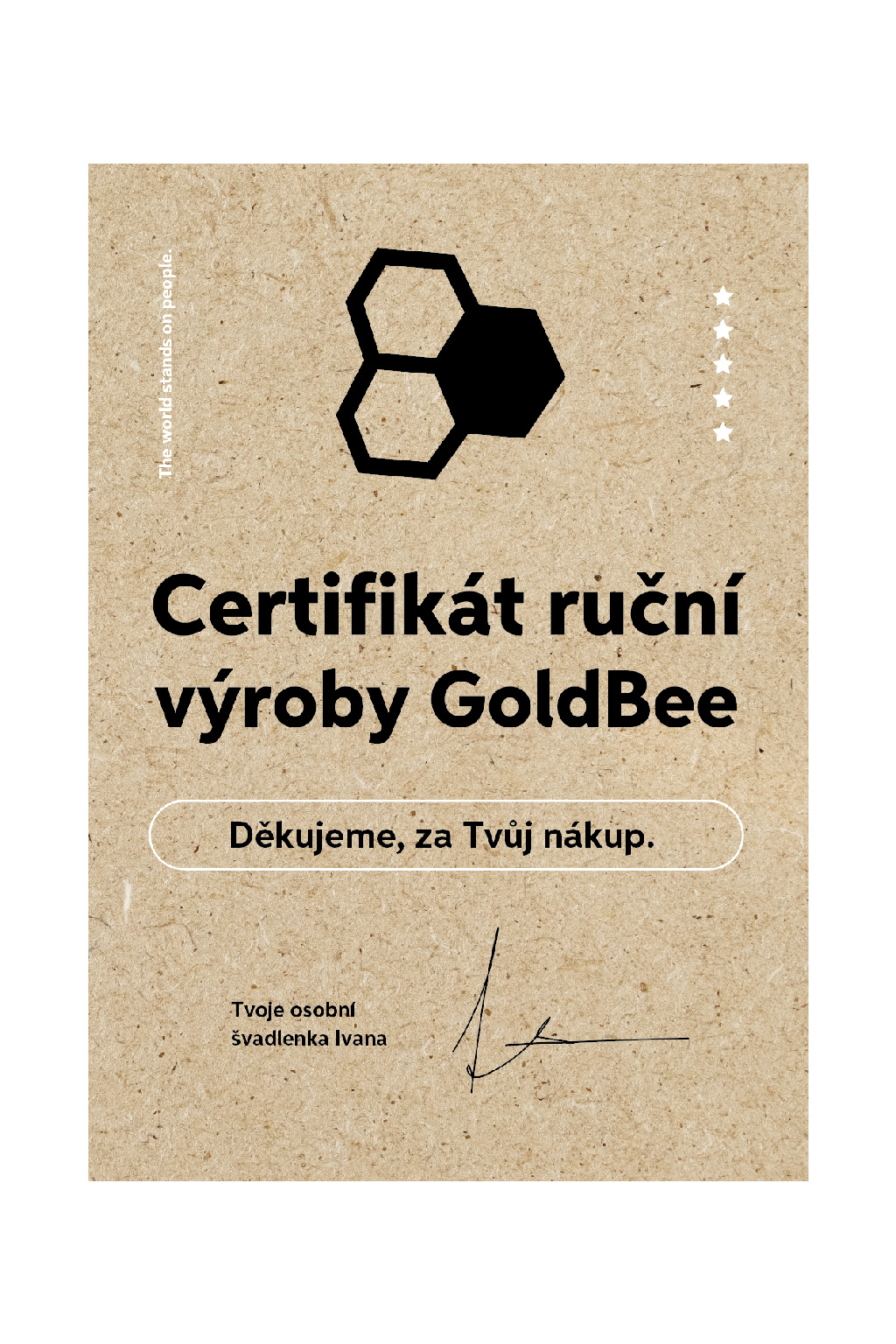 Podporuješ rád/a českou výrobu? Záleží Ti na udržitelnosti? Vážíš si každého ručně ušitého kousku GoldBee? V tom případě tohle všechno můžeš mít černé na bílém (korkovém) a podpořit nás tímto Certifikátem ruční výroby GoldBee.Jedná se o designovou, korkovou destičku s podpisem jedné z našich šikovných švadlenek. Tento certifikát je originální nápad, jak ozvláštnit dárek pro Tvé blízké. A my věříme, že všem vykouzlí úsměv na tváři.