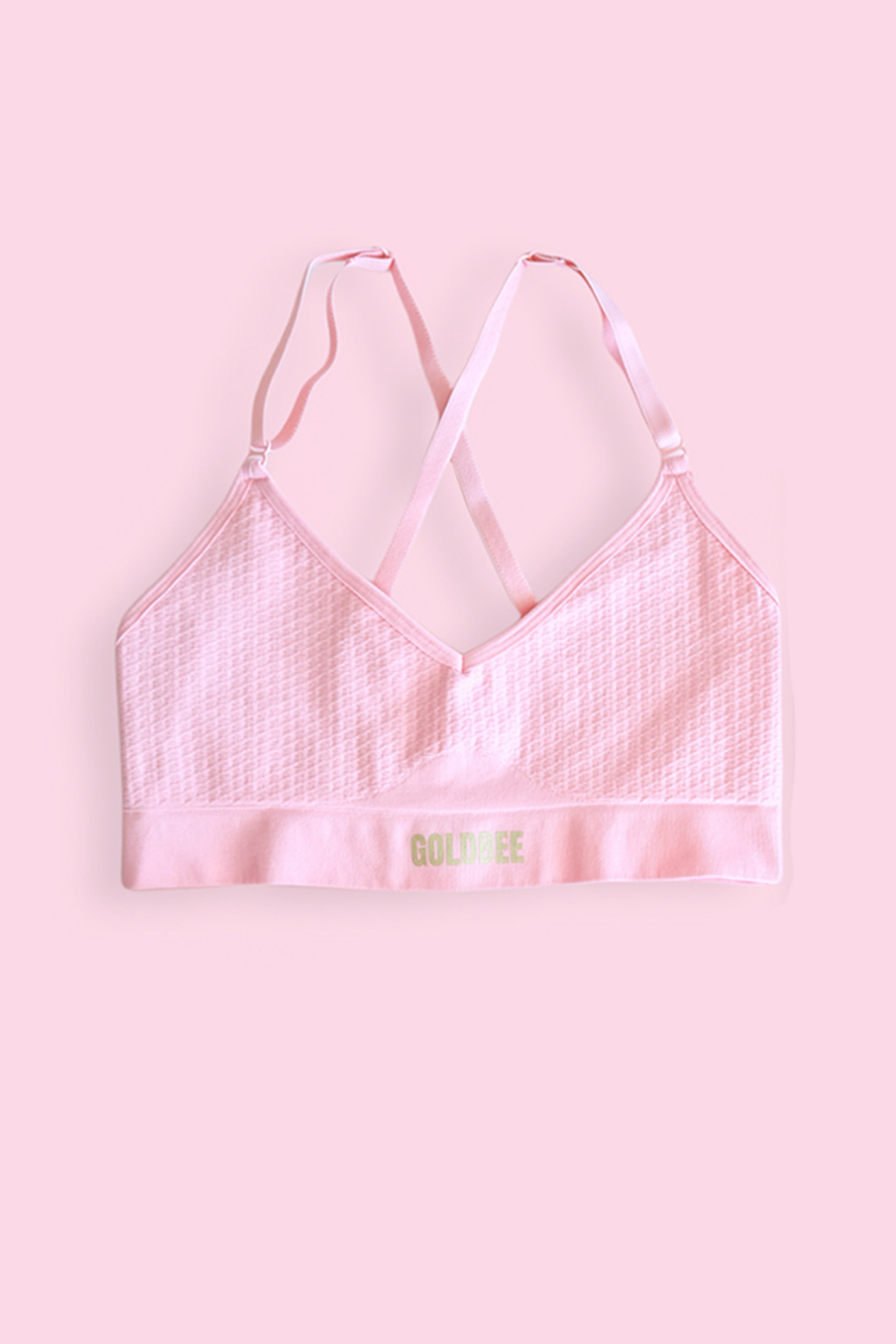 Bezešvá podprsenka se zlatým logem GOLDBEE pod prsy. Svou pružností a tvarem se lehce přizpůsobí vašemu poprsí. Podprsenka má výstřih tvaru V a elegantní zkřížená ramínka s možností úpravy délky dle vašich představ. ✨